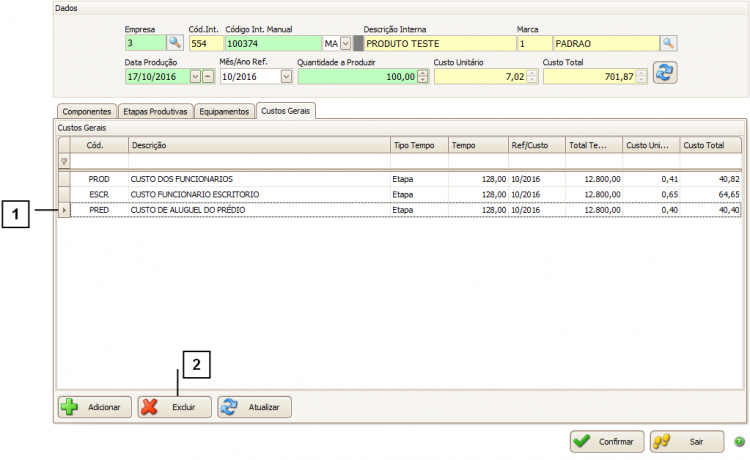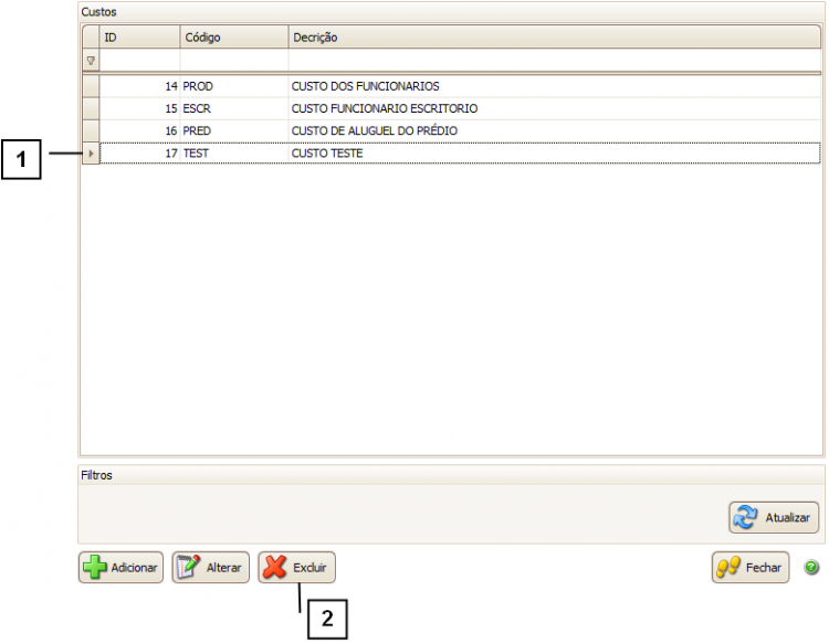 Selecione na grid o custo que deseja alterar (1) e clique no botão Excluir (2).