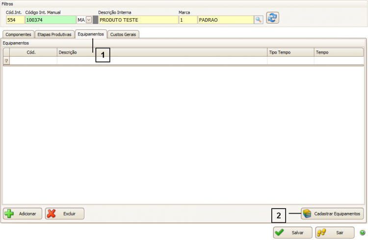 Preencha o Equipamento (1), o Tempo (2) que é utilizado para produzir o item dependerá do “Tipo” (3).