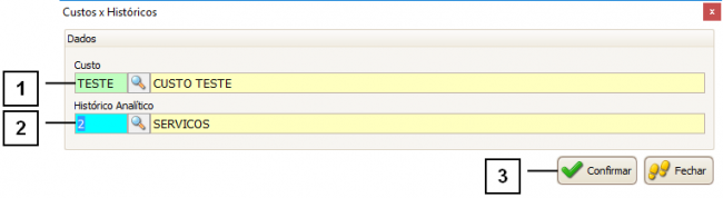 Abrirá a tela para vincular o Custo ao Histórico Analítico, selecione o Custo (1) e o Histórico Analítico (2), depois clique em confirmar (3).