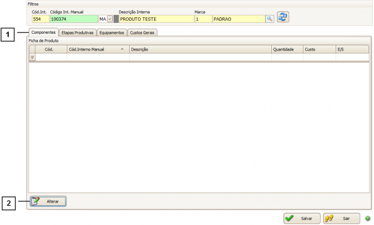 Na aba “Componentes” (1) caso o produto já possua uma produção, serão listados os componentes nessa aba. Caso queria adicionar componentes, clique em “Alterar” (2).