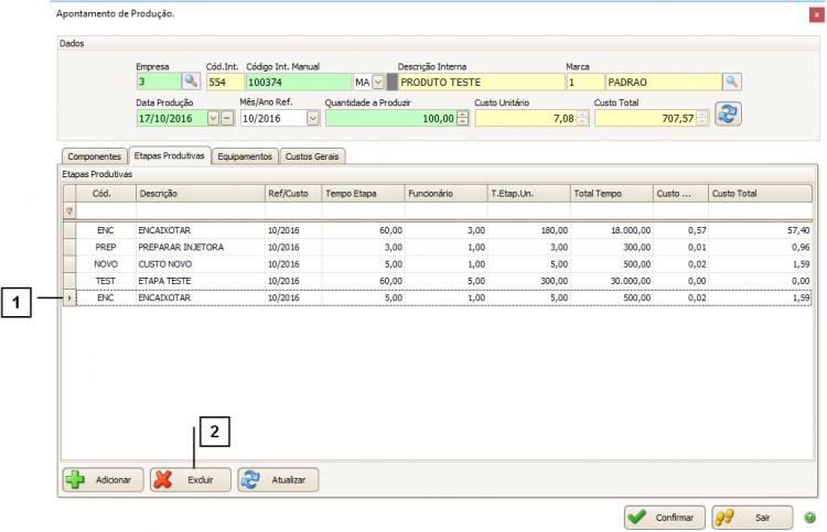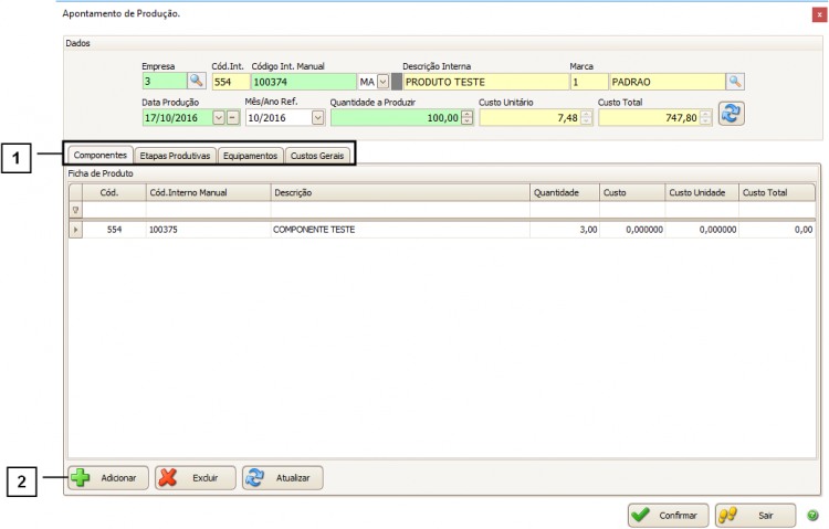 Os custos adicionados no “Apontamento de Produção”, somente serão contabilizados nesse processo. O custo cadastrado na ficha do produto não será alterado.
