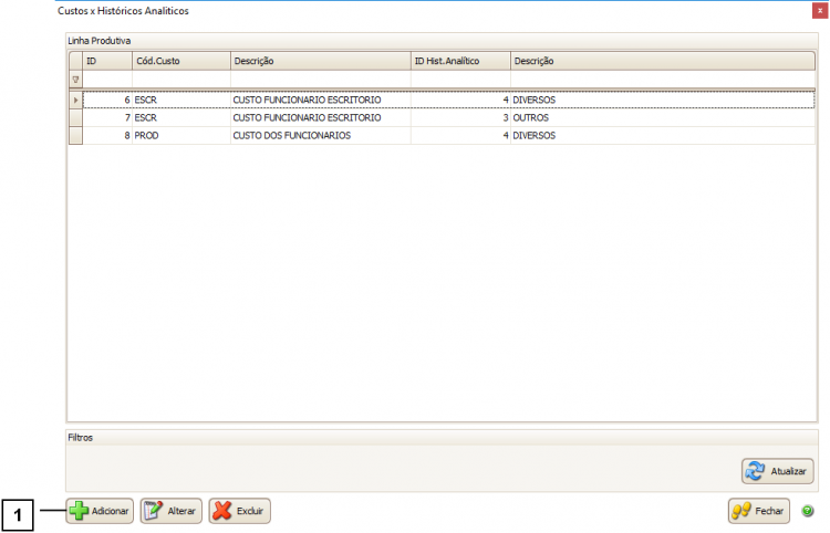Para vincular um custo a um histórico analítico clique em adicionar (1).
