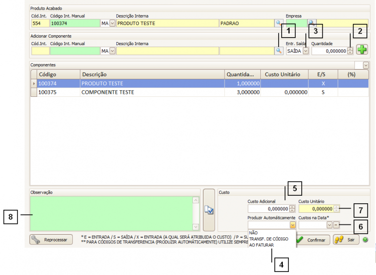 Com os componentes preenchidos, selecione “Produzir Automaticamente” (4) e escolha uma das opções.Caso tenha algum custo adicional para produzir esse item, poderá ser preenchido em “Custo Adicional” (5) e preencha a data referente ao custo no“Custos na Data” (6)