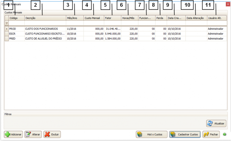 Ao abrir a tela de “Custos Mensais”, você poderá visualizar na parte superior da grid as seguintes informações: