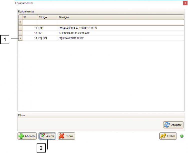Selecione o item (1) que deseja alterar na grid, e clique em alterar (2).