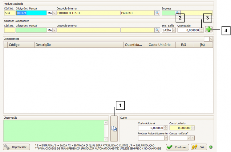 Para adicionar uma fórmula manualmente, selecione o primeiro item da fórmula, o qual deve ser o “Item Pai” que será produzido. O campo “Entrada / Saída” (2) preencha com “Entrada. Custo”.Preencha a quantidade (3) e clique no “+” (4).