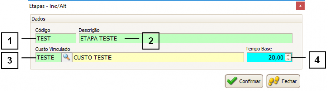 Na tela que se abrir preencha com a Etapa (1), Quantidade de Funcionários (2) e Tempo em segundo (3) utilizado para executar esta etapa. Após isso, clique em “Confirmar” (4).