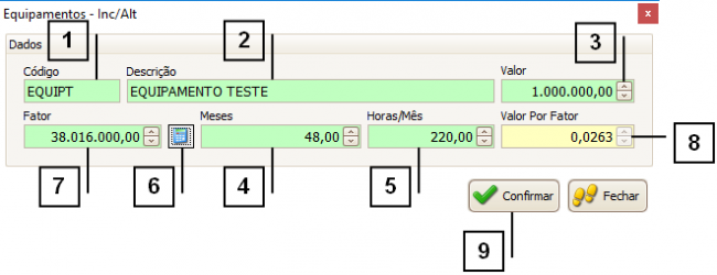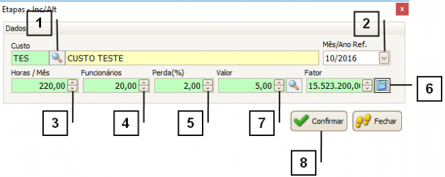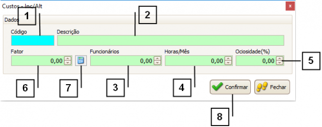 O “Fator” (6) é calculado de acordo com as informações preenchidas na quantidade de funcionários, horas/mês, ociosidade(%). Para calcular, clique na calculadora (7). Esse será o fator levado em conta na hora da produção.