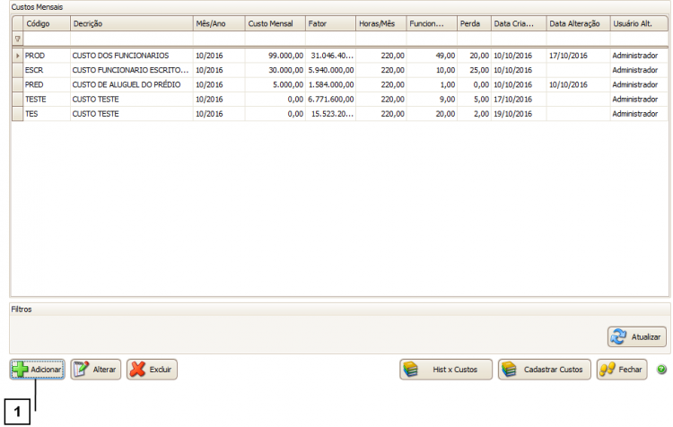 Para cadastrar um novo custo mensal, clique em “Cadastrar Custos” (1)