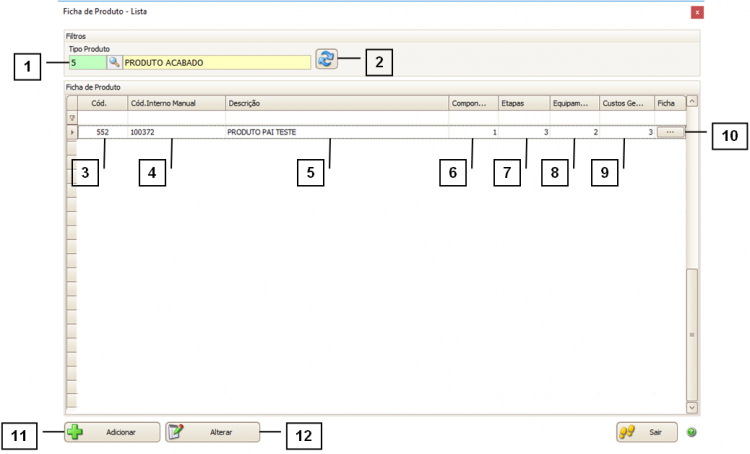 10. Gerar Ficha: Fornece a ficha do produto com as informações lançadas no apontamento de produção.