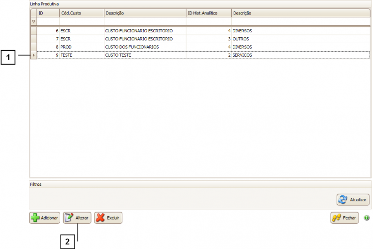 Selecione na grid o custo que deseja alterar (1) e clique no botão alterar (2).