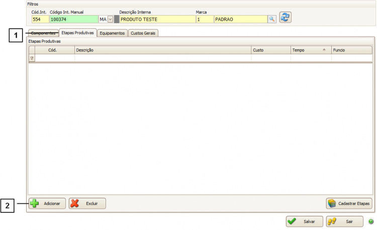 Na aba de “Etapas Produtivas”(1) clique em “Adicionar” (2).