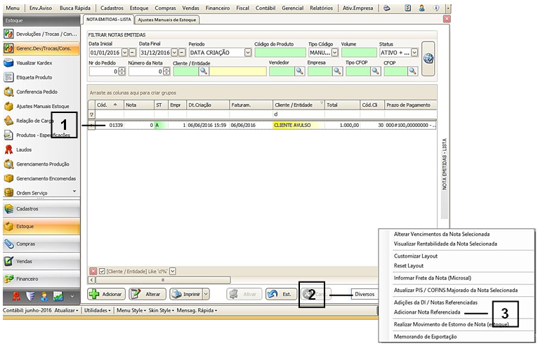 Localize (1) a nota que deseja e clique em “Diversos” (2) > “Adicionar Nota Referenciada” (3).