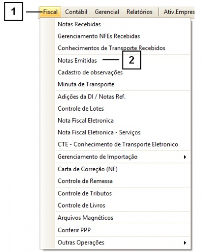 Primeiramente, acesse “Menu Superior” > “Fiscal” (1) > “Notas Emitidas” (2).