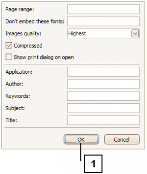 Após gerado o relatório, no “Menu Superior”, clique em “Export Document...” (1) > “PDF File” (2).