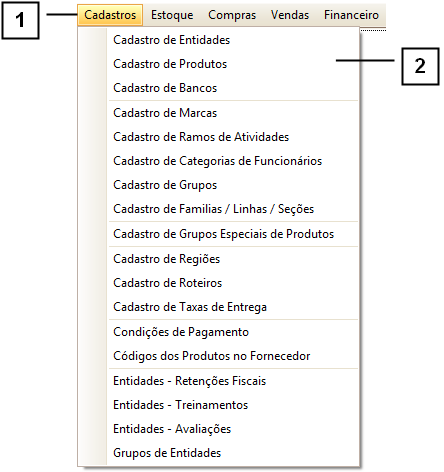 Para acessar a tela de alterar grupo dos produtos sem venda clique em: “Menu Superior” > “Cadastros” (1) > “Cadastro de Produtos” (2).
