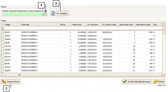 Para que os dados sejam exibidos na GRID é necessário preencher o campo “Mostrar somente produtos sem vendas a mais que xx dias” (1), com a quantidade de dias desejada.