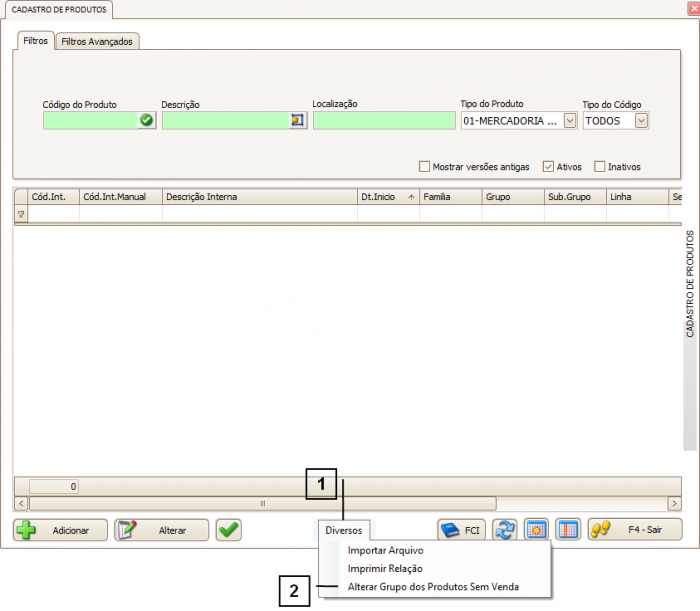 Na tela de Cadastro de Produtos, clique em: “Diversos” (1) > “Alterar Grupo dos Produtos Sem Venda” (2).