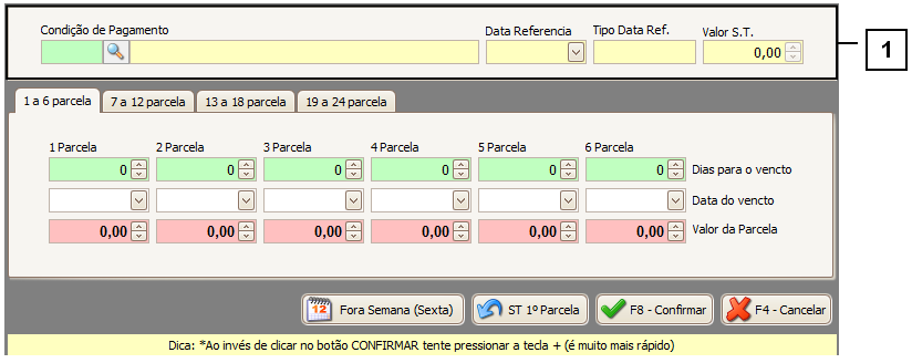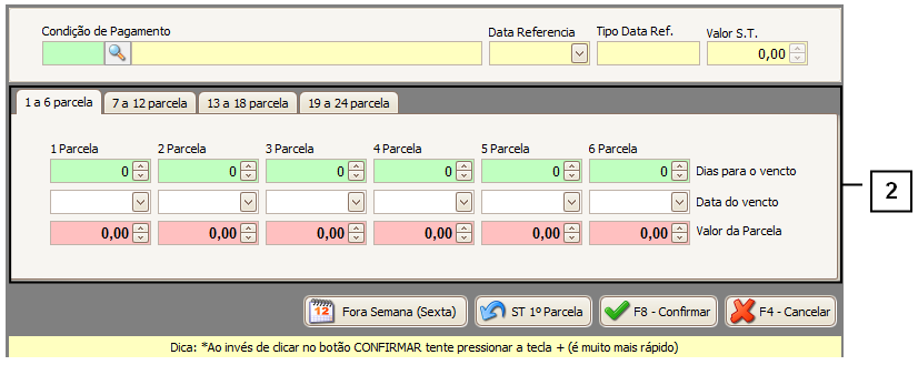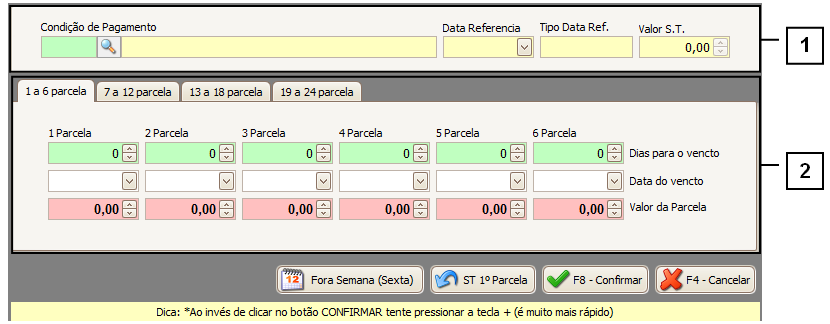 Nota: Ao selecionar uma condição de pagamento cadastrada não será valido alterar os dados manualmente, pois irá considerar SOMENTE a condição originalmente selecionada.