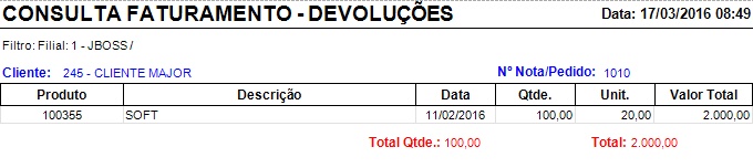 Ambos os relatórios podem ser gerados para os Faturamentos, Devoluções e Pedidos a Faturar.