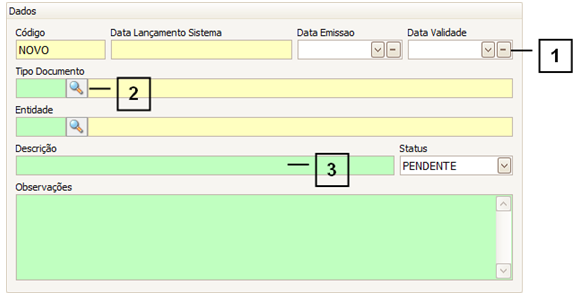 Utilize o campo “Data de Validade” (1), pois ela irá auxiliá-lo a controlar o vencimento dos documentos, isso permitirá que você tome ações de renovação, cobrança, entre outras.