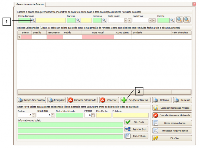 Após acessar a tela de boletos, selecione o Banco (1) e clique em "Sel./Gerar Boletos" (2).