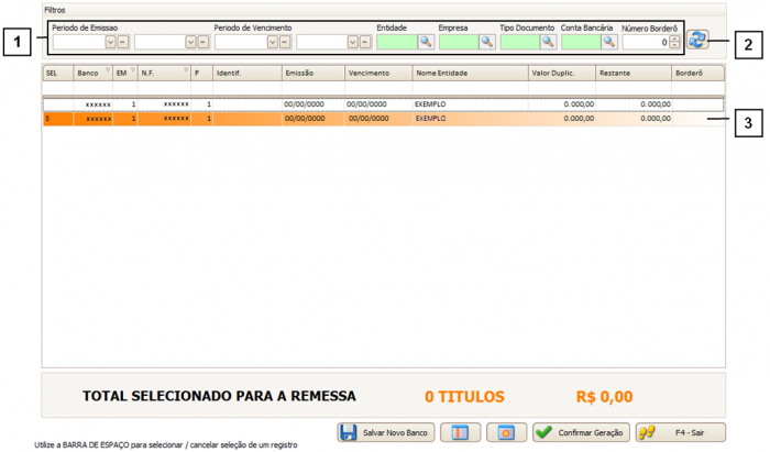 Preencha os filtros na parte superior da tela (1), clique em “Atualizar” (2), e selecione na “GRID” (3) os títulos que serão enviados para desconto.