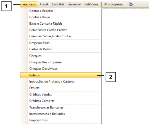 Para acessar a tela de boletos clique em “Menu Superior” > “Financeiro” (1) > “Boletos” (2).