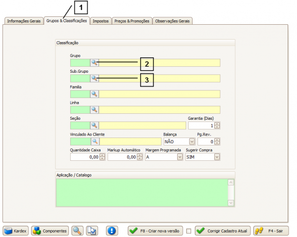Os campos da aba "Grupos e Classificações" (1) servirão apenas para futuros relatórios e filtros.
