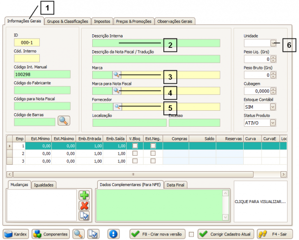 Por default a aba a abrir é a Informações Gerais (1), esta servirá para cadastrar as informações básicas do produto.