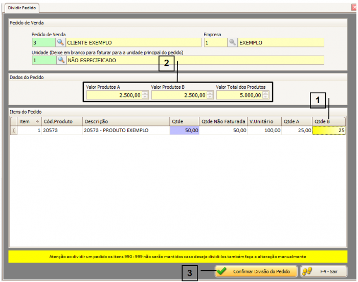 Note que os valores presentes no bloco “Dados do Pedido” (2) serão atualizados conforme a divisão feita.