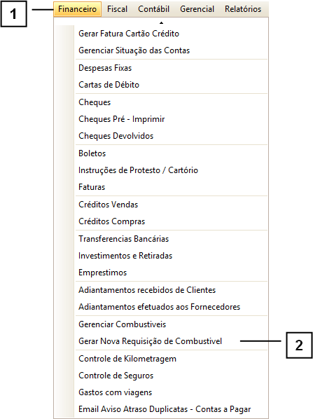 Para acessar a tela de Gerar Nova Requisição de Combustível clique em: “Menu Superior” > “Financeiro” (1) > “Gerar Nova Requisição de Combustível” (2).