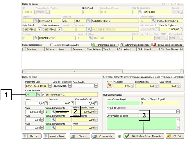 2. Empresa Origem: Informar a Empresa referente à conta bancária movimentada com a quitação do título. No caso “Empresa 2”, uma vez que a conta foi paga no banco “Banco Empresa 2”.
