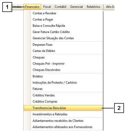 Para isso, acesse “Menu Superior” > “Financeiro(1) > “Transferências Bancárias(2).