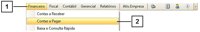 Primeiramente, deve-se localizar a conta que se deseja efetuar a baixa. Para isso, acesse “Menu Superior” > “Financeiro(1) > “Contas a Pagar(2).