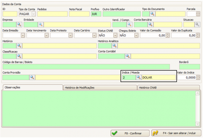 2. Fazer o lançamento da conta no financeiro (pagar ou receber) e informar o índice no lançamento.
