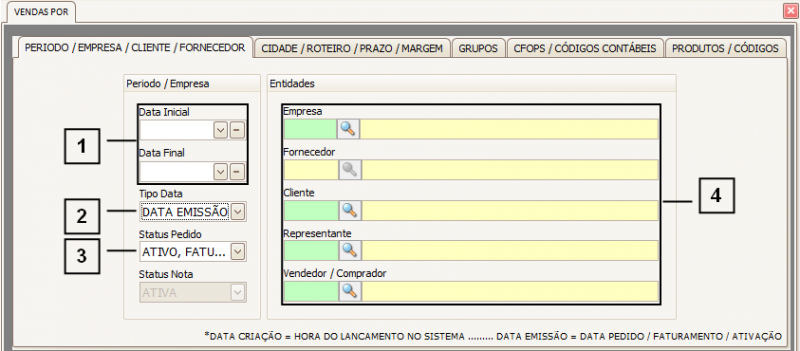 Pelo campo “Tipo Data” (2) é possível definir se você deseja filtrar o período pela data da criação (DATA CRIAÇÃO) do pedido ou pela data de ativação (DATA EMISSÃO/FISCAL) do mesmo.
