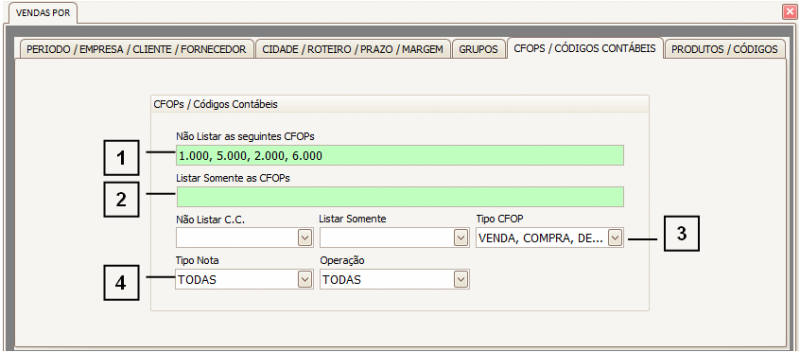 Também é possível filtrar pelo “Tipo CFOP” (3) (venda, compra,devolução, etc.) e pelo “Tipo da Nota” (4).