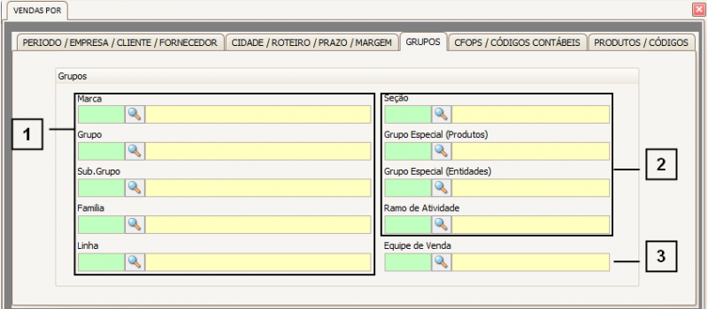 Na aba “Grupos” pode-se filtrar as informações exibidas no relatório de acordo com as informações dos produtos vendidos (1), por grupos especiais de cadastro (2) e também pelos pedidos de uma determinada equipe de venda (3).
