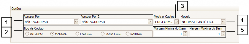 Em “Opções”, é possível selecionar até dois tipos de agrupamentos diferentes (1) para as informações exibidas no relatório, bem como qual será o tipo de código (2) exibido. Também é possível escolher se serão exibidos os custos (3) e qual tipo do custo, o Modelo (4) que do relatório a ser gerado, se será “Normal Sintético” ou “Normal Analítico”. Os filtros “Margem Mínima do Item” e “Margem Máxima do Item” (5) funcionam semelhantes aos filtros de Margem da aba “Cidade/Roteiro/Prazo/Margem”, porém, ao invés de definir a margem a ser exibida pelo total do pedido, ele seleciona e exibe somente os itens que estão dentro da margem nos pedidos de venda. É possível visualizar isso através do Modelo Normal Analítico.