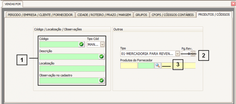 Na aba “Produtos/Códigos” é possível filtrar as informações exibidas no relatório de acordo com o código, descrição, localização ou observação cadastrada no produto vendido (1).